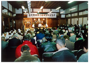 金光教典楽会は、昭和29年12月9日に、金光教典楽会として承認されてより50年の節目を迎えました。この50年を記念して、平成17年2月19日、20日の本部練習会時に行っている感謝祭並びに報徳祭に合わせて、典楽会結成50年記念式を開催しました。 この結成50年に向けて、役員会や代表委員会で内容の検討を重ね、まず、記念の祭典、そして記念曲の披露と講演を主とした式典、さらに祝宴の3部構成で「典楽会結成50年記念式」を執行することを決め、記念事業として、記念曲作成と典楽会の歴史「典楽ものがたり」の刊行を行うことも合わせて決まりました。 記念曲については、過去の典楽会だよりでも報告してきました通り、山下美香氏に作曲のご尽力をいただき、また、その曲を審議委員はじめ関係各位の努力によって、典楽会結成50年記念曲「典楽とコーラスのための組曲『教祖讃仰』」として完成し、CD作成まで行うことができました。 また、記念誌「典楽ものがたり」は、三矢田光氏の論文をもとに金光図書館の資料を合わせて刊行の運びとなりました。 そして、2月19日、この記念の年の本部練習会を迎えることができました。当日は、例年の練習会とは違い、記念式の準備に奔走し、特に修徳殿という初めての会場で、慣れないこともありましたが、本部各機関の先生方と参加者の協力を得て、準備を進めることができました。 会場の修徳殿は、お祝いに駆けつけてくださったご来賓の方々と練習会に参加した楽員によって埋め尽くされ、午後2時、いよいよ記念式の開会です。 第1部祭典は、久保田紘二総務部長のご祭主により厳かに仕えられ、それぞれのここまでのお礼とここからの典楽会の発展を祈り、また、これまで典楽会を支えてくださった霊様方にお礼を申し上げました。 祭典後、当初予定していた記念撮影は、あいにくの雨天で中止となり、休憩を挟んで、第2部の式典へと移りました。榎本会長の式辞に続いて、鈴木甫教務総長より祝辞を賜り、このたび完成した記念曲の披露となりました。限られた時間でのリハーサルで本番を迎えましたが、この曲に込められた願いがナレーションで流され、いよいよ洋楽と典楽による記念曲演奏の時を迎えました。作曲者の山下氏も見守る中で、コーラスの指揮者、金光混声合唱団の佐藤先生がゆっくりと指揮を始めると笙の音が会場を包み、演奏が開始されました。演奏者とコーラス奉仕者の緊張感がひしひしと会場に伝わり、3部に及ぶ組曲の「教祖讃仰」が披露されました。 その後、三矢田光氏(大阪府島之内教会)の記念講演では、典楽を違った切り口から我々に紐解いて下さいました。(講話は、別掲で連載していきます) 式典も終わり、玉水教会控所へ会場を移した第3部の祝宴は、今までの緊張感から解放され、和やかな雰囲気で、各支部の紹介や即興での出し物など、賑やかに楽しい時間を過ごして、午後8時、祝宴もお開きとなりました。しかし、話しは尽きず、その後もそれぞれの部屋へと移動して歓談は続き、結成50年記念式の夜は更けていきました。 |