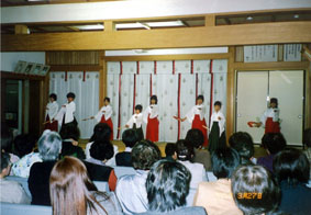 中国支部では、毎年奉納舞、演奏舞など、1年間行われた舞を中心に、12月に再度練習の成果を発表しておりますが、今年は嗜好を変えて、舞人全員が舞装束をつけ、お化粧をし、仮舞台での生演奏を本格的な出で立ちで3才から24、5才頃の舞人が、14曲を披露すると見ている人たちは「素晴らしい」と感動されておられました。舞人38名、箏34名、管方21名による演奏でした。