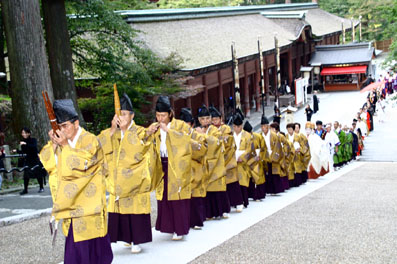 ![]() 『天台宗開祖1200年平和祈念会』における道楽(2005/10/21) | 典楽と聞いて一番に思い出したのは、明治5年旧12月15日のお知らせである。それは「太鼓は打つに及ばない。17日には門の注連鳥居は、取り片付けよ」というものである。このことから教祖様は、明治5年末まで太鼓を用いて御祈念をされていたと推察できる。しかし外圧のため、太鼓を打っての御祈念を自重し、神社のような注連鳥居は片づけられたのであろう。ちなみにこの日は、いわゆる神前撤去の1ヶ月前のことである。 |